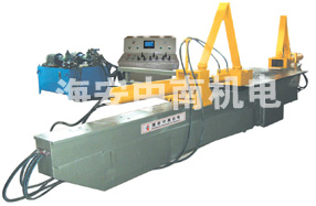 拉彎機(jī)結(jié)構(gòu)革新特指一種拉彎機(jī)結(jié)構(gòu)改良。拉彎機(jī)的結(jié)構(gòu)改良包括有機(jī)架、轉(zhuǎn)臂,機(jī)架上側(cè)結(jié)合有一大盤,而機(jī)架前端兩側(cè)對(duì)稱樞接兩轉(zhuǎn)臂,轉(zhuǎn)臂上軌面安裝有附帶夾頭的活缸座,驅(qū)動(dòng)轉(zhuǎn)臂的拉彎油缸的一端鉸接于機(jī)架靠前段,另一端由活塞桿之外端鉸接于轉(zhuǎn)臂的內(nèi)側(cè)凸緣上,該凸緣位于轉(zhuǎn)臂的靠外段上,所述機(jī)架、轉(zhuǎn)臂及拉彎油缸之間為活動(dòng)三角關(guān)系。拉彎機(jī)的拉彎油缸無須穿過轉(zhuǎn)臂內(nèi)中部,由此轉(zhuǎn)臂也就無須在內(nèi)中部鏤空,確保拉彎機(jī)轉(zhuǎn)臂的一體性,加強(qiáng)了拉彎機(jī)轉(zhuǎn)臂的強(qiáng)度和剛性。
